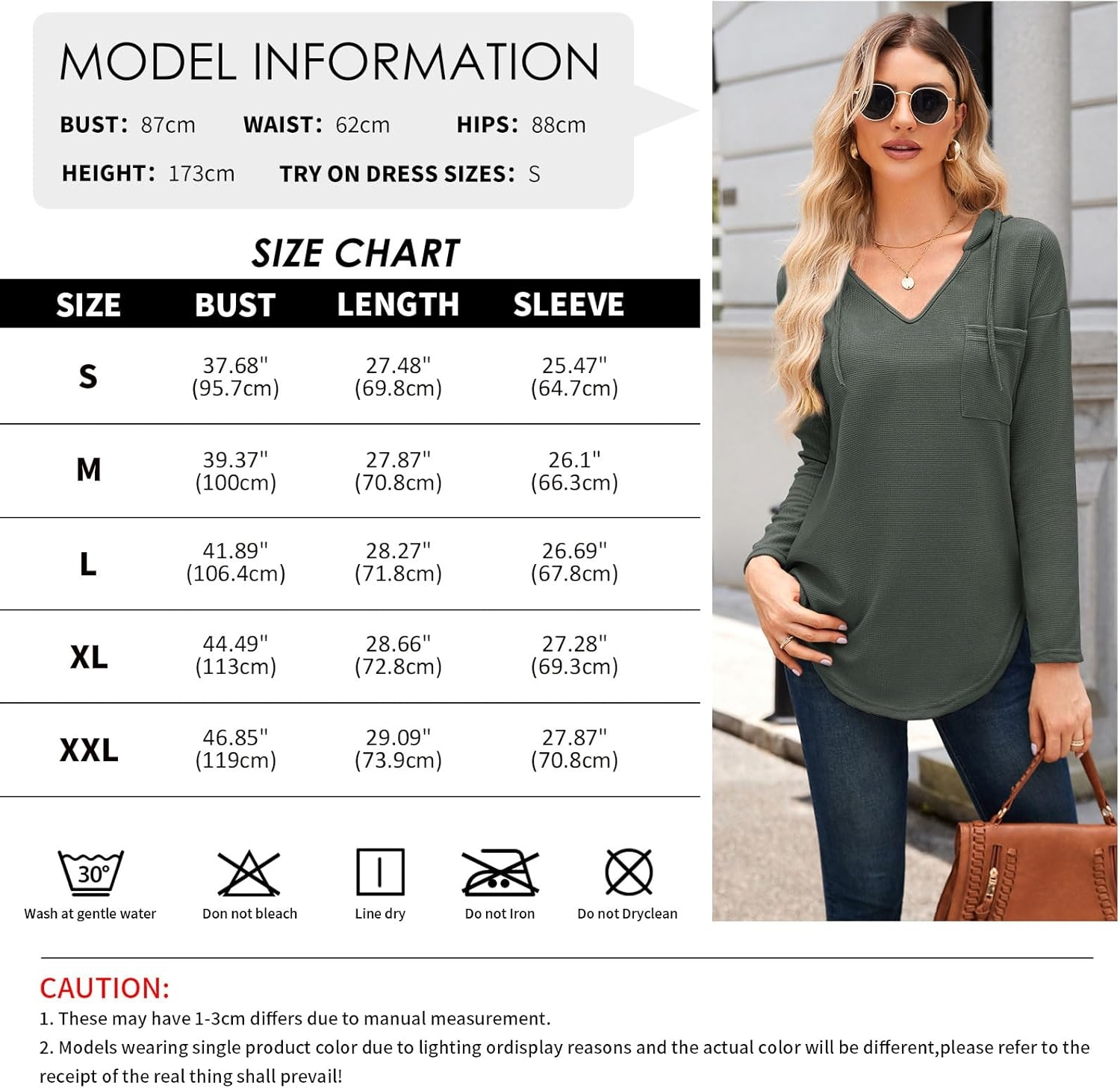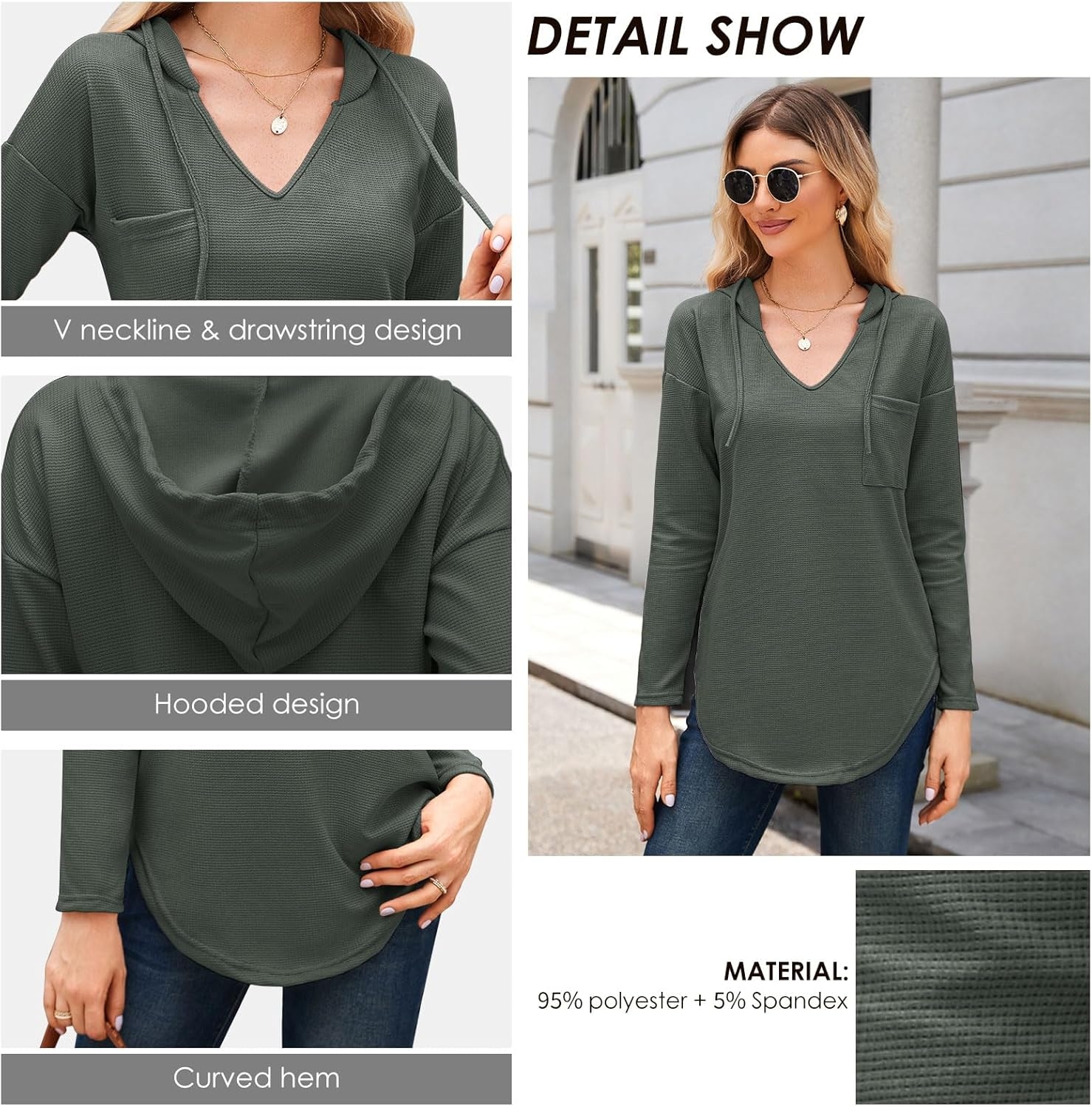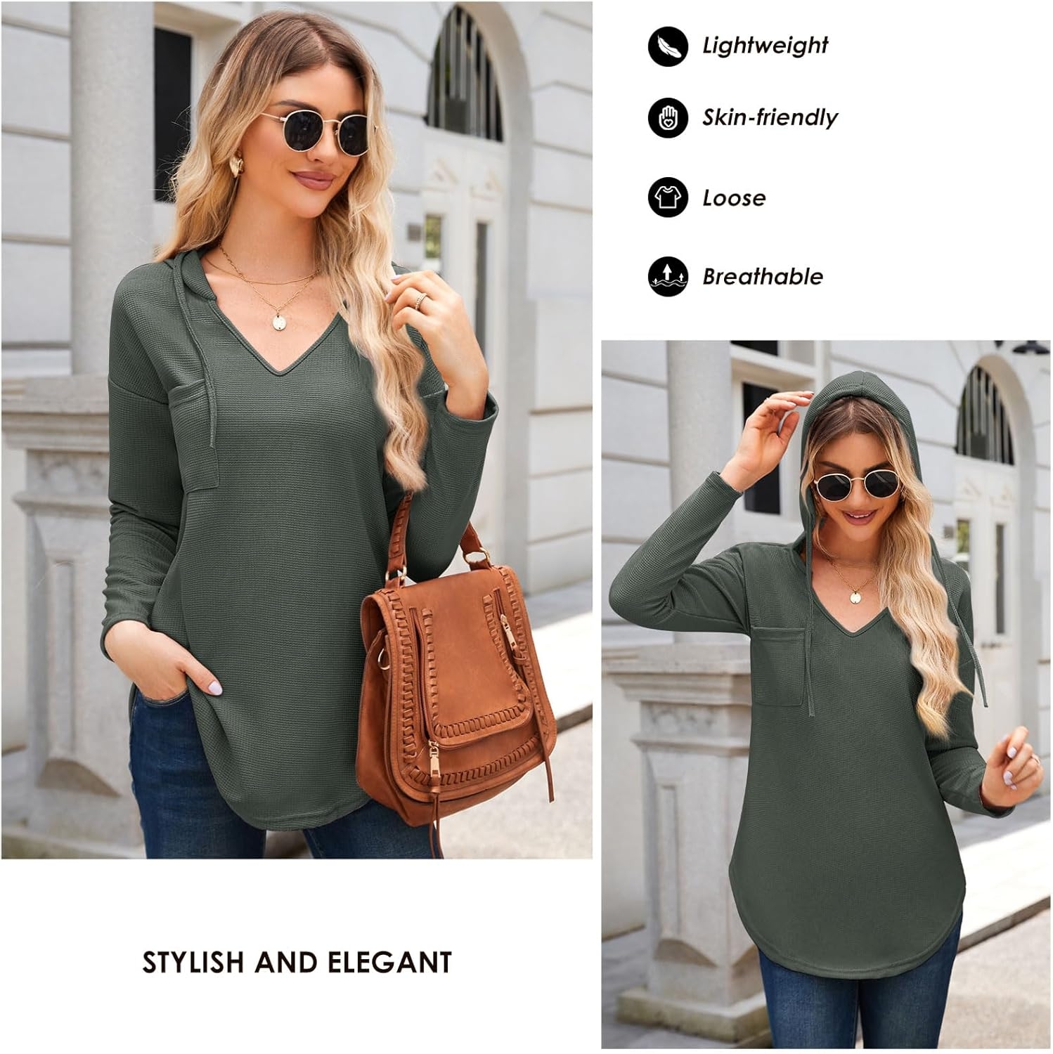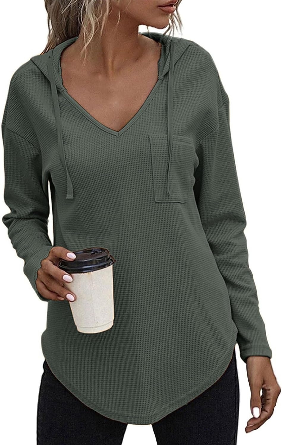 Bluza damska w kolorze ciemnozielonym, wykonana z miękkiego materiału o fakturze waflowej. Posiada luźny krój z długim rękawem, kaptur ze sznurkami oraz dekolt w kształcie litery V. Z przodu znajduje się praktyczna kieszonka na piersi. Dół bluzy został lekko zaokrąglony, co dodaje jej kobiecego charakteru. Bluza świetnie sprawdzi się w codziennych stylizacjach, łącząc wygodę z modnym wyglądem. Idealna na spacer, spotkanie ze znajomymi czy jako wygodny element garderoby domowej