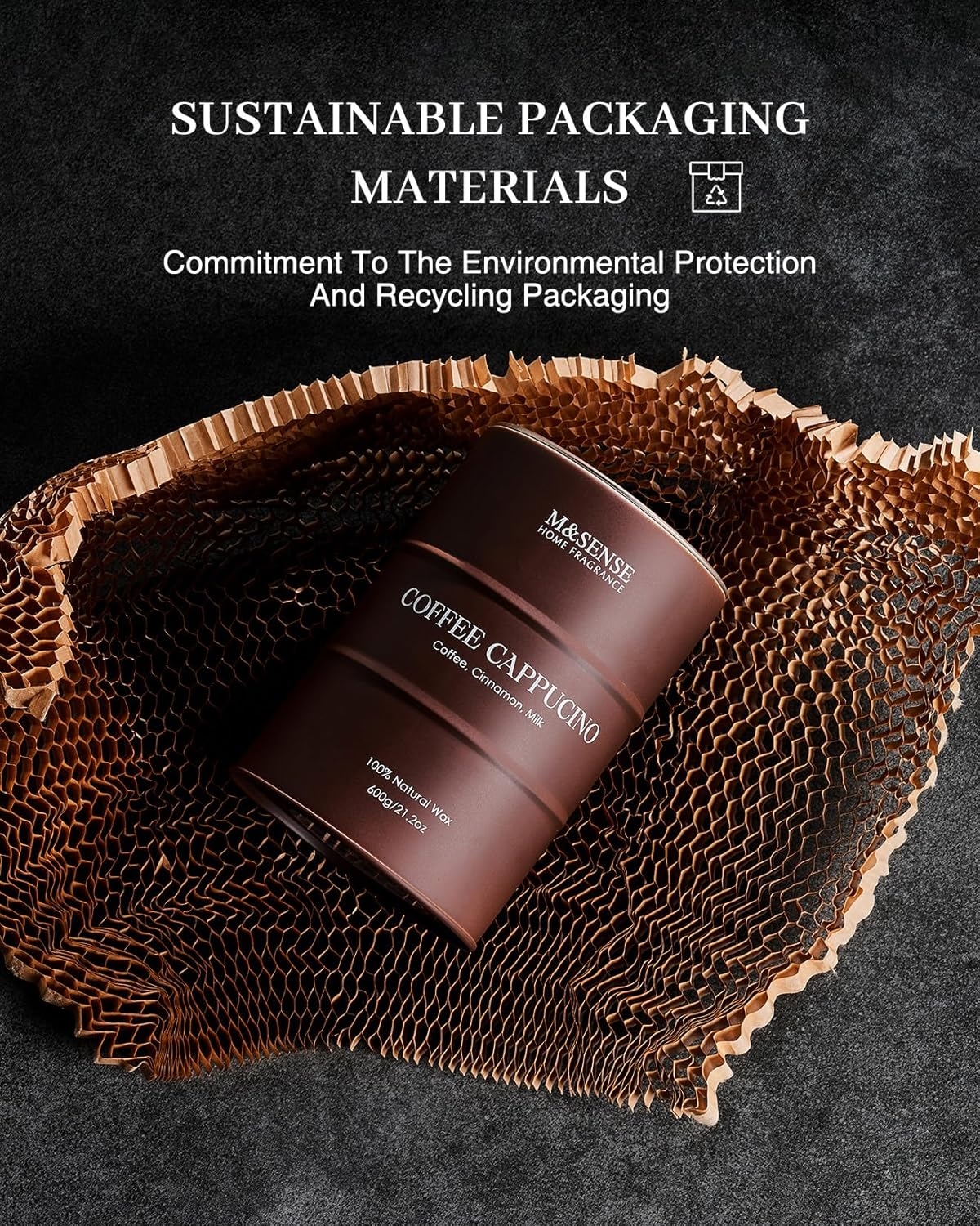 - Zrównoważony materiał – wszystkie świece M&SENSE są wykonane z najlepszych i najbardziej naturalnych składników. Zastosowanie wysokiej jakości wosku roślinnego i niebielonej bawełny knoty w puszce wielokrotnego użytku i nadającej się do recyklingu. Zapakowany w papier o strukturze plastra miodu i karton z recyklingu dla bardziej zrównoważonej przyszłości.